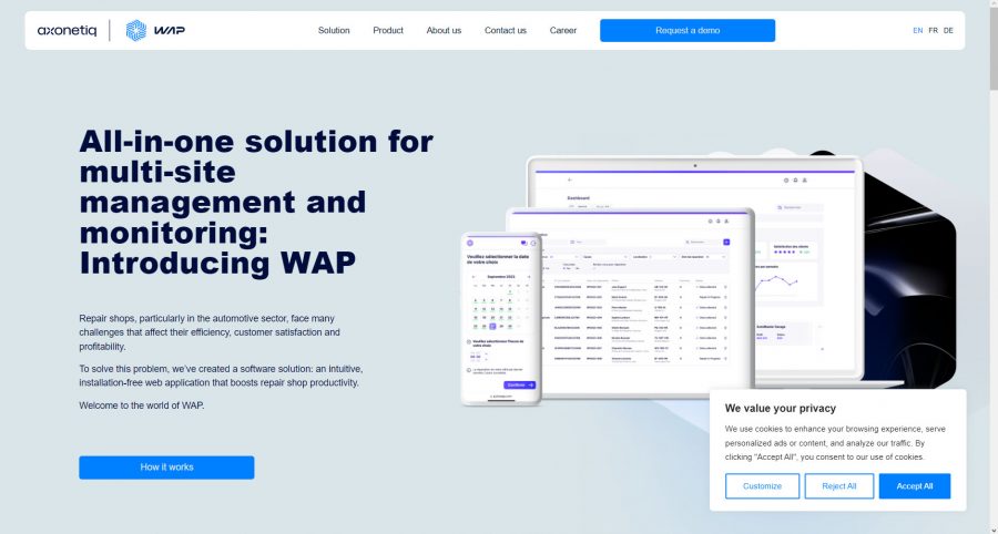 Diseño y maquetación de web corporativa Axonetiq en WordPress y con Elementor. Gráficos SVG desde Figma. Ajustes CSS adicionales para completar todo el multidispositivo. Multi idioma y traducciones personalizadas.