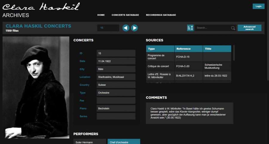 Diseño web para visualización de los registros de las bases de datos de Clara Haskil. Diseño de las bases de datos en MySQL. Programación PHP para las consultas a las bases de datos, búsquedas y filtrado de resultados. Modo claro y oscuro. Ajustes CSS para completar todo el multidispositivo.
