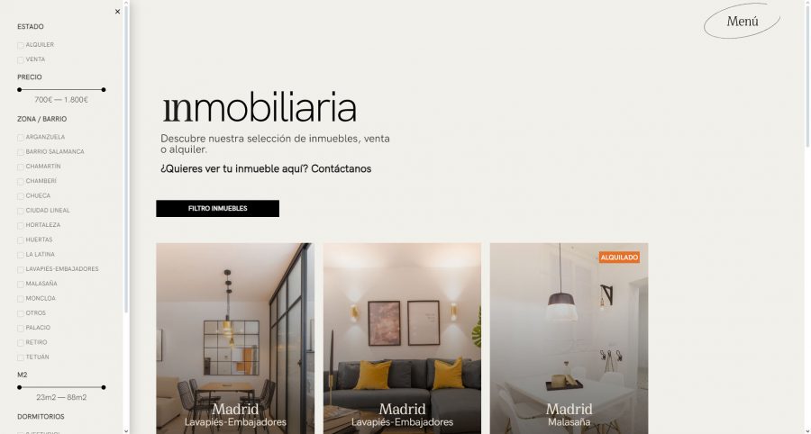 Maquetación de web corporativa Intopía Living con Elementor. Sección de inmobiliaria para venta y alquiler de inmuebles. Creación de Custom Post Types con JetEngine para la gestión de inmuebles. Filtros con JetSmartFilters.