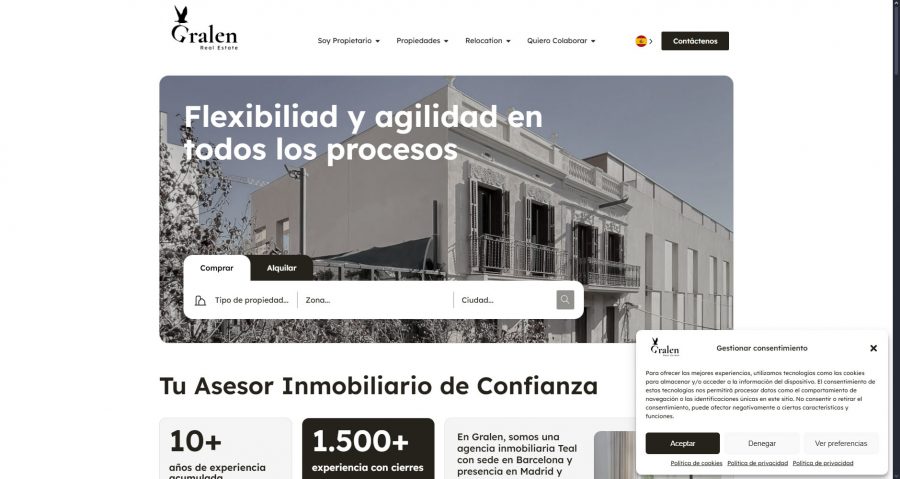 Diseño y maquetación de web corporativa inmobiliaria Gralen con WordPress y Elementor a medida, desde cero y totalmente automatizada. Custom Post Types con JetEngine y filtros avanzados con JetSmartFilters. Conexión con CRM para carga de inmuebles. Crons personalizados. Multi idioma 2 idiomas con Weglot. Ajustes CSS adicionales para completar todo el multidispositivo.